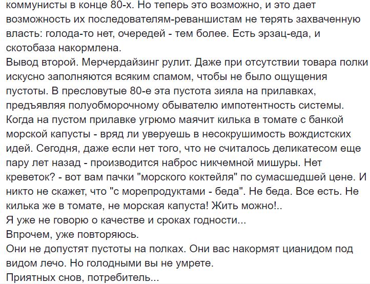 “Имитация еды - то, чего не могли себе позволить коммунисты в конце 80-х. Но теперь это возможно, и это дает возможность их последователям-реваншистам не терять захваченную власть”, - подчеркнул журналист, добавив, что “Кремль от революции спасают мерчендайзеры”.