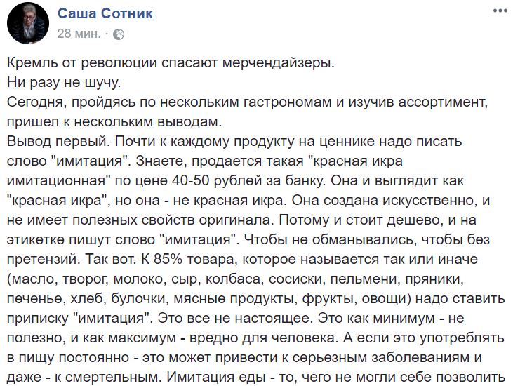 “К 85% товара, которое называется так или иначе (масло, творог, молоко, сыр, колбаса, сосиски, пельмени, пряники, печенье, хлеб, булочки, мясные продукты, фрукты, овощи) надо ставить приписку "имитация". Это все не настоящее. Это как минимум не полезно, и как максимум - вредно для человека. А если это употреблять в пищу постоянно - это может привести к серьезным заболеваниям и даже к смертельным”, - отметил Сотник, пройдясь по магазинам.