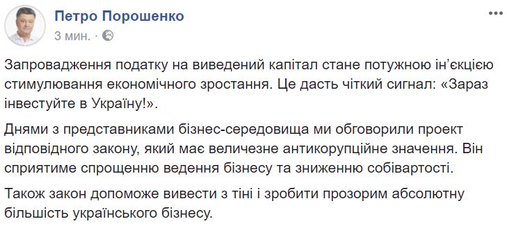 Порошенко обратил внимание, что отдельные политические силы оказывают яростное сопротивление законопроекту о налоге на выведенный капитал, однако это не позволило и, пообещал президент, в дальнейшем не позволит заблокировать важную реформу.