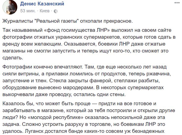 “Казалось бы, что может быть проще — придти на все готовое и зарабатывать в магазине, который за тебя построили и открыли другие люди? Но “молодой республике” оказалась непосильной даже эта задача”, - отметил журналист, констатировав, что Луганск достался “безнадежным дегенератам”, которые не то что городом, магазином управлять не способны.