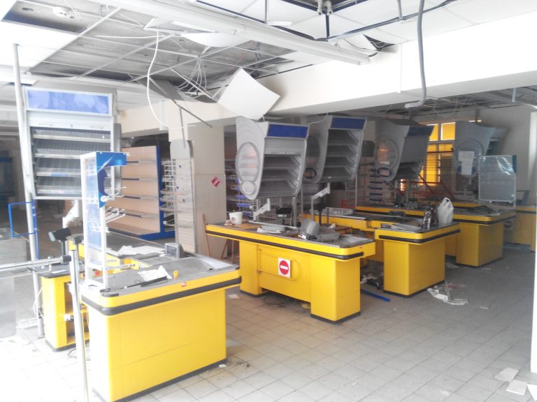 Магазины, где еще несколько лет назад полки ломились от разнообразных товаров, теперь в запустении и постепенно разрушаются. Все они поголовно разграблены, у некоторых украдена даже проводка.