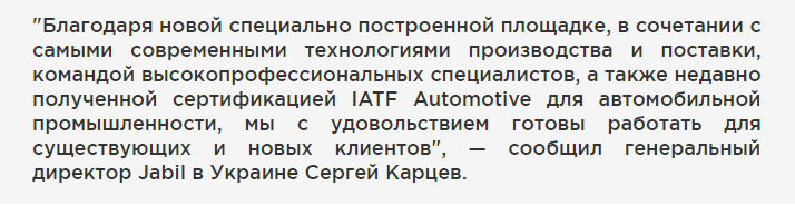 Интересно, что Закарпатской структурное подразделение Jabil является одним из самых крупных в корпорации. Новый завод задействован в производстве деталей для мобильных телефонов, медиаплееров и компьютерной техники на экспорт в страны Европейского союза.