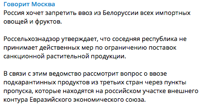 Россия расширяет экономическую войну в отношении Беларуси. Готовится запрет на ввоз в РФ всех овощей и фруктов из Беларуси.