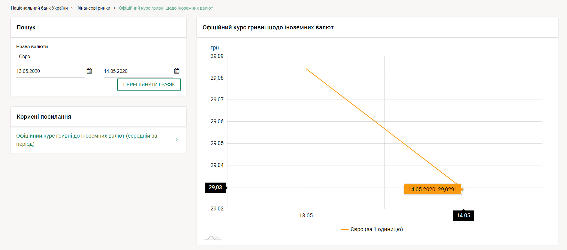 Снизилась в цене и валюта Европейского Союза: по состоянию на утро четверга за один евро гражданам Украины придется отдать 29 гривен 3 копейки. Это на 5 копеек дешевле, чем было вчера, 13 мая: тогда евро стоил 29 гривен 8 копеек.