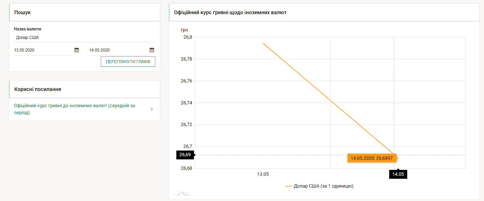 В четверг утром, 14 мая, один доллар на валютном рынке Украины стоил 26 гривен 69 копеек, что на 10 копеек дешевле по сравнению с прошедшим днем. Одновременно за один евро украинцы сегодня могут отдать 29 гривен 3 копейки. Это на 5 копеек дешевле, чем в среду, 13 мая.