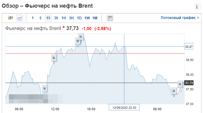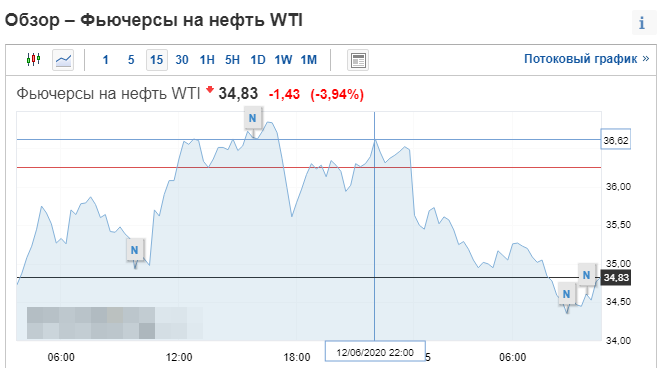 Фьючерсы по WTI проявили абсолютно похожую динамику и перед закрытием торгов, 12 июня, держались на уровне 36 долларов. Но уже в 8:45 15 числа опустились до 34,36 доллара за бочку.
