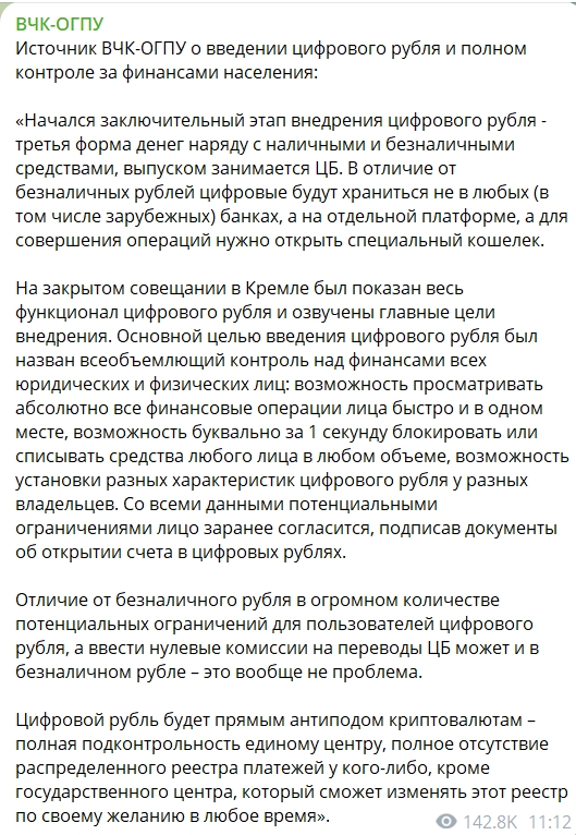 "Цифровой рубль будет прямым антиподом криптовалютам – полная подконтрольность единому центру", — предупредил ВЧК-ОГПУ.