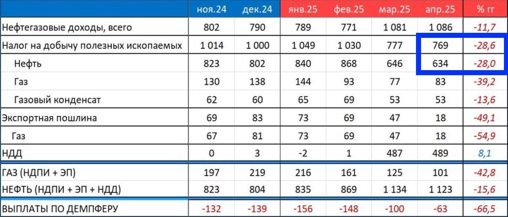 В целом нефтегазовые доходы российского бюджета в апреле 2025 года снизились к апрелю 2024 года на 11.7%.