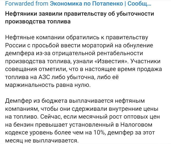 На днях российские СМИ писали, что нефтяные компании РФ обратились к правительству ввести мораторий на обнуление демпфера (бюджетные субсидии нефтяным компаниям, направленные на сдерживание внутренних цен на топливо в том случае, когда экспортная цена выше), пожаловавшись на убыточность производства топлива в России. Они отметили, что на сегодняшний день продажа топлива на АЗС либо убыточна, либо ее маржинальность равняется нулю.