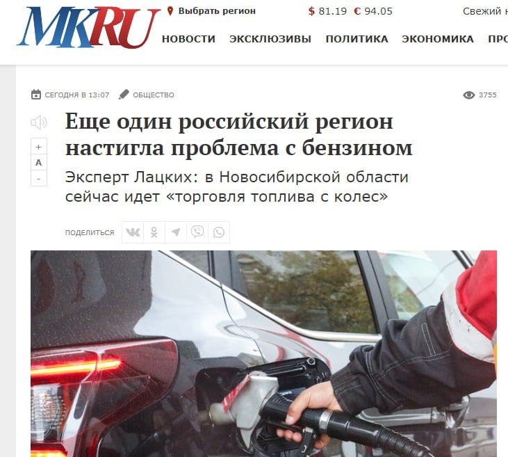 Отмечается, что глава "Сибирь-ГСМ" и по совместительству президент Ассоциации независимых нефтетрейдеров Российского топливного союза в Новосибирской области Сергей Лацких заявил, что запасы бензина марок АИ-92 и АИ-95 уже закончились у подавляющего большинства членов упомянутой ассоциации.