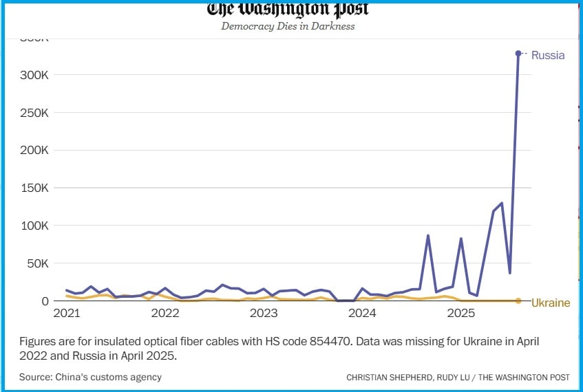 Летом текущего года Китайская Народная Республика существенно увеличила экспорт компонентов для изготовления ударных дронов на оптическом волокне в страну-оккупант Российскую Федерацию, информирует The Washington Post со ссылкой на аналитиков.