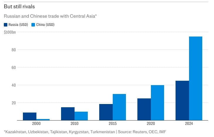 Россия теряет контроль над регионом, который долгие годы считала своей вотчиной. По данным The Telegraph, в 2024 году торговля Китая с Казахстаном, Узбекистаном, Таджикистаном и Кыргызстаном составила почти 95 млрд долларов, это более чем вдвое превышает российский показатель (около 45 млрд).
