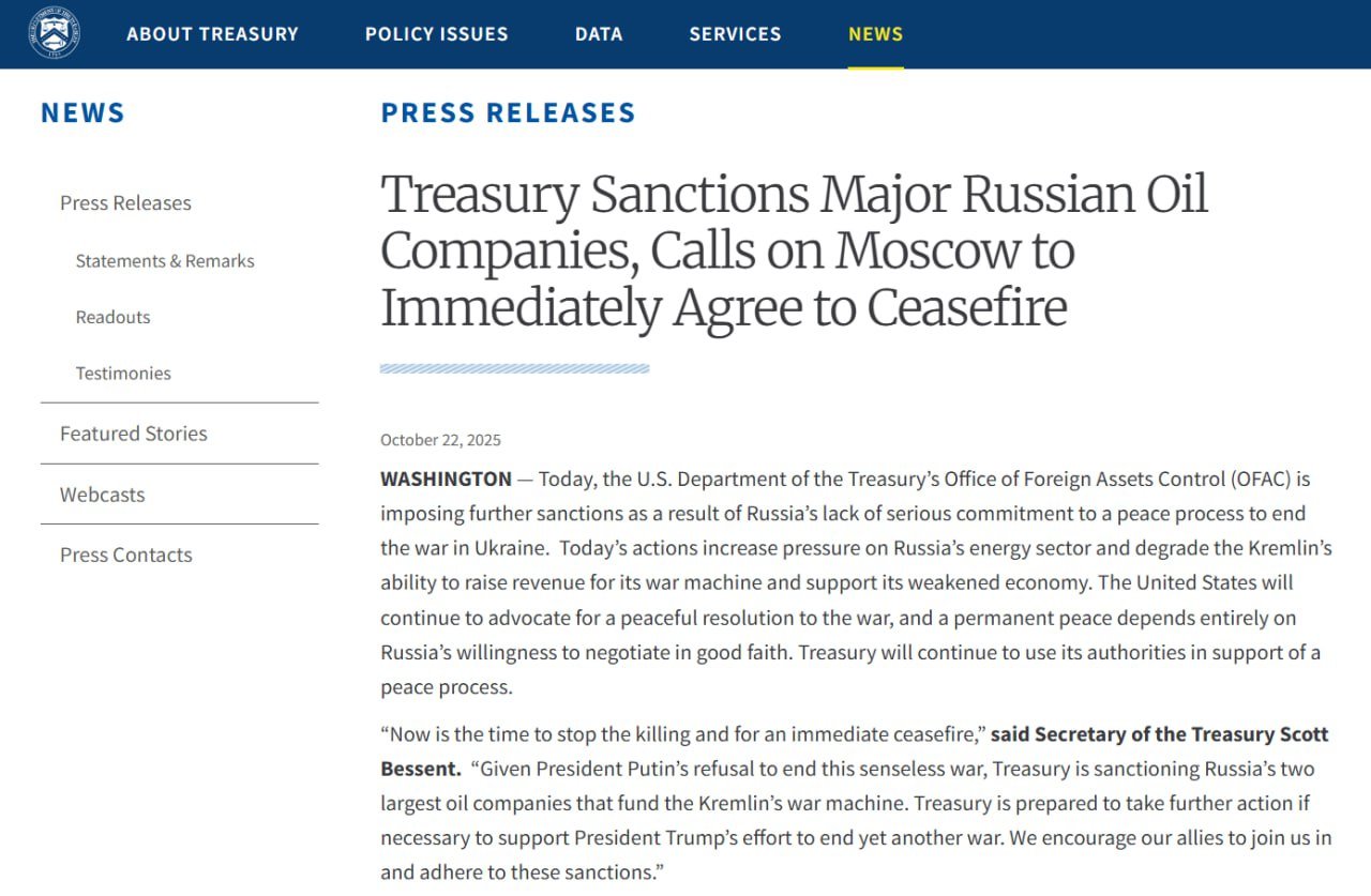 В Вашингтоне опубликовали полный список 34 российских компаний, попавших в "черный список". Бессент также призвал союзников присоединиться к новым санкциям против России.
