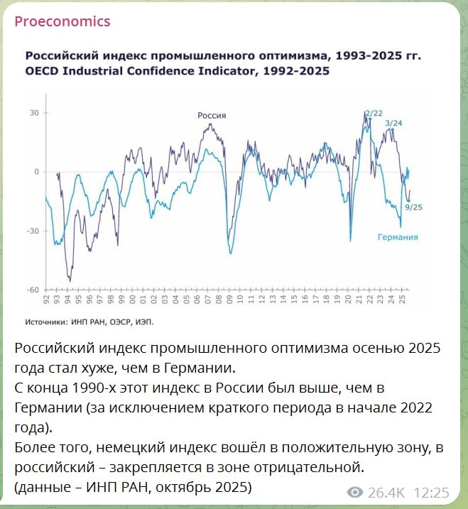 Параллельно с PMI упал и российский индекс промышленного оптимизма — показатель уверенности бизнеса в будущем. По данным ИНП РАН и ОЭСР, осенью 2025 года он стал хуже, чем в Германии — впервые за последние 25 лет (за исключением короткого периода начала 2022-го).