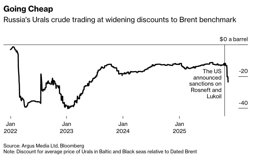 Согласно Argus, скидка на Urals выросла до 23,52 доллара к Brent — максимум с июня 2023 года. Такая разница — это сигнал, что российскую нефть теперь берут только с огромным дисконтом, а значит лишь те, кто готов рискнуть под санкциями. Bloomberg подчёркивает: покупатели опасаются вторичных санкций США, которые могут накрыть любой бизнес, работающий с российским топливом.
