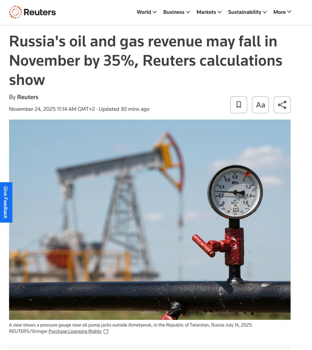 По оценке Reuters, в ноябре нефтегазовые доходы России рухнут примерно на 35% по сравнению с прошлым годом. Для бюджета, который держится преимущественно на сырьевом экспорте, это серьезный удар, особенно на фоне огромных военных расходов.