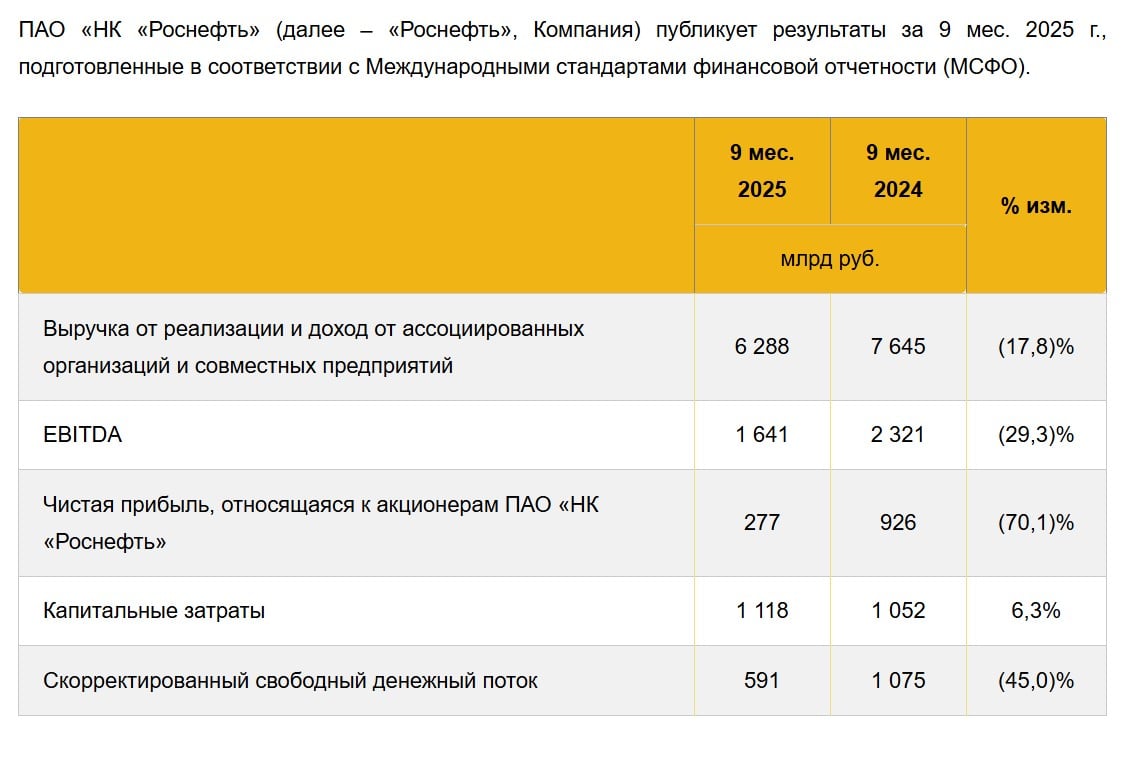 "Роснефть" сократила чистую прибыль акционеров по МСФО за 9 месяцев текущего года на 70% в сравнении с аналогичным периодом прошлого года – до 277 млрд рублей.