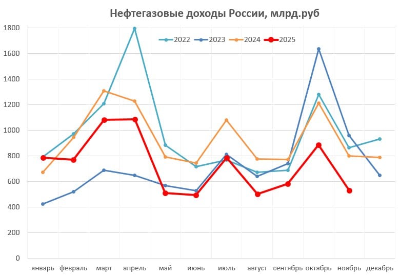 С начала года Россия собрала 8 трлн рублей нефтегазовых доходов – на 2,3 трлн меньше, чем в 2024-м. Темпы падения лишь ускоряются: если в мае отставание составляло 14%, то к декабрю выросло до 22%.
