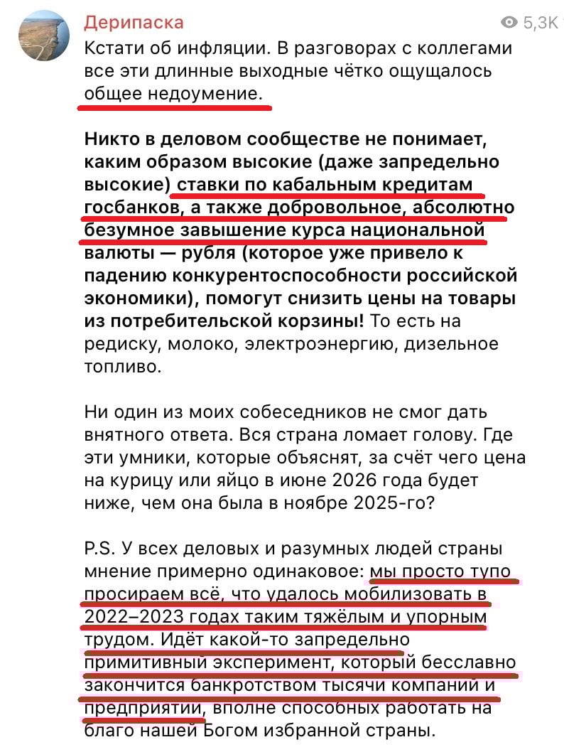 Когда такие слова звучат не от оппозиции, а от системного миллиардера, это тревожный сигнал. Российская экономика, заточенная под войну и ручное управление, начала ломаться изнутри. Даже выгодоприобретатели режима больше не могут объяснить, куда и зачем страну ведут, отмечают обозреватели.