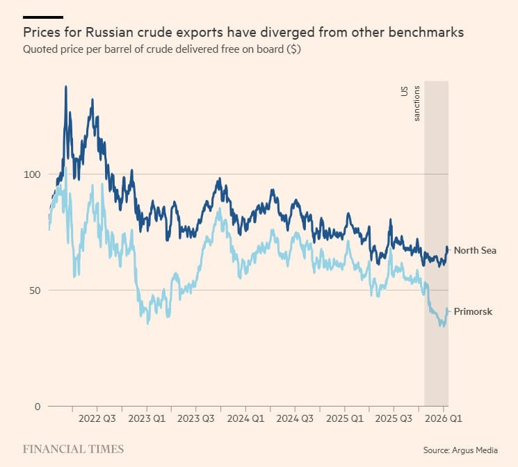 По данным Financial Times, экспортные поступления от нефти снизились, чему способствовали как санкции, так и падение цен. В ноябре 2025 года разрыв между Brent, опустившейся до минимальных значений с 2021 года, и российской Urals почти удвоился. Скидка на Urals превысила $24 за баррель против $15 за последние два года.