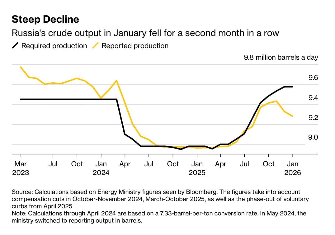 Bloomberg предупреждает: если добыча продолжит снижаться, Россия рискует потерять свою долю на мировом нефтяном рынке. Освободившееся место могут занять другие страны ОПЕК+, которые не испытывают таких ограничений и готовы быстро нарастить поставки.
