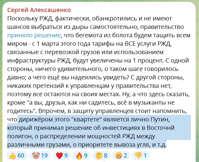 По словам Алексашенко, виновником провала РЖД является лично Путин, "который принимал решение об инвестициях в Восточный полигон, о распределении мощностей РЖД между различными грузами, о приоритете вывоза угля".