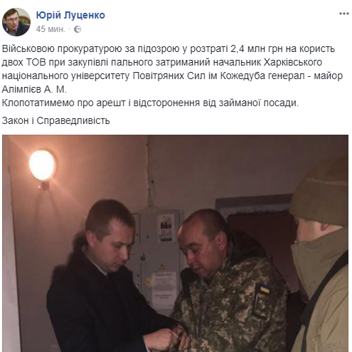 "Военной прокуратурой по подозрению в растрате 2,4 млн грн в пользу двух ООО при закупке горючего задержан начальник Харьковского национального университета Воздушных сил им. Кожедуба генерал-майор Алимпиев А. М. Будем ходатайствовать об аресте и отстранении от занимаемой должности", - написал Генпрокурор.