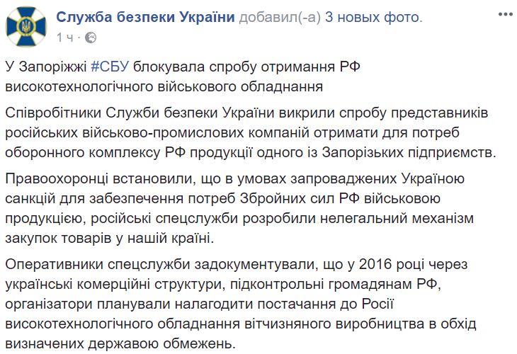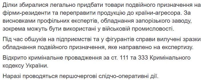 Представители спецслужбы отметили, что некие российские военно-промышленные компании попробовали “разжиться” оборудованием двойного назначения запорожского предприятия. Его наверняка использовали бы для строительства военной техники, уверены в СБУ.