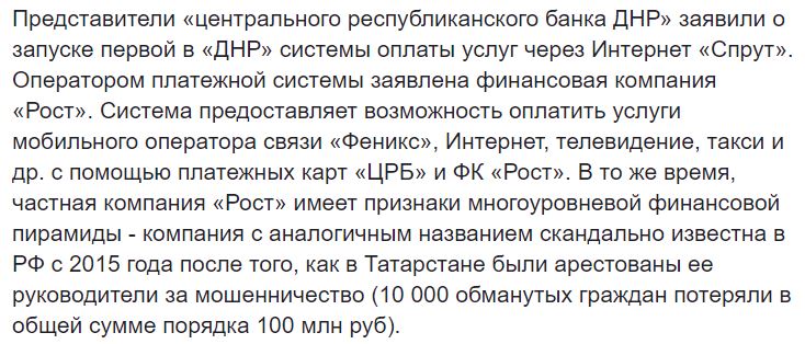 Более того, в 2015 году “Рост” обманул около 10 тысяч граждан Татарстана, украв у них более 100 миллионов рублей. Руководство пирамиды арестовали, после чего скандальная компания возродилась уже на Донбассе.