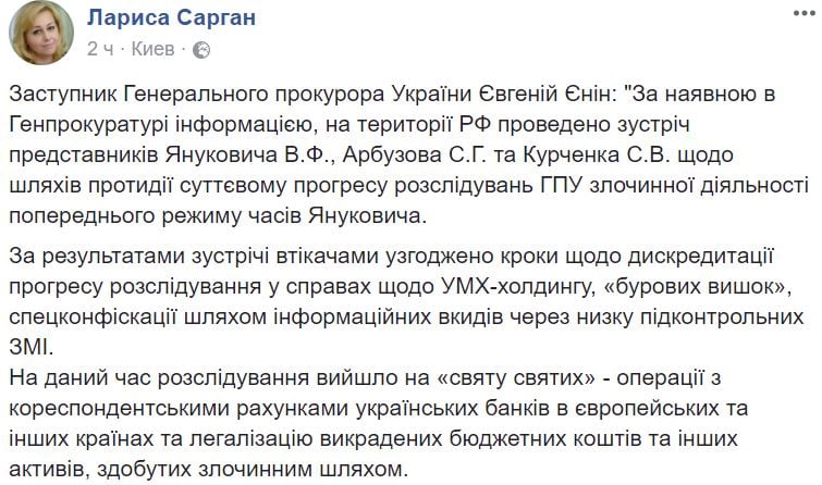 Енин отметил, что в тайной встрече участие приняли представители экс-президента Виктора Януковича, экс-премьер-министра Сергея Арбузова, а также олигарха Сергея Курченко. Они обсуждали “существенный прогресс” украинского следствия в отношении их начальников, а также договаривались о его срыве.