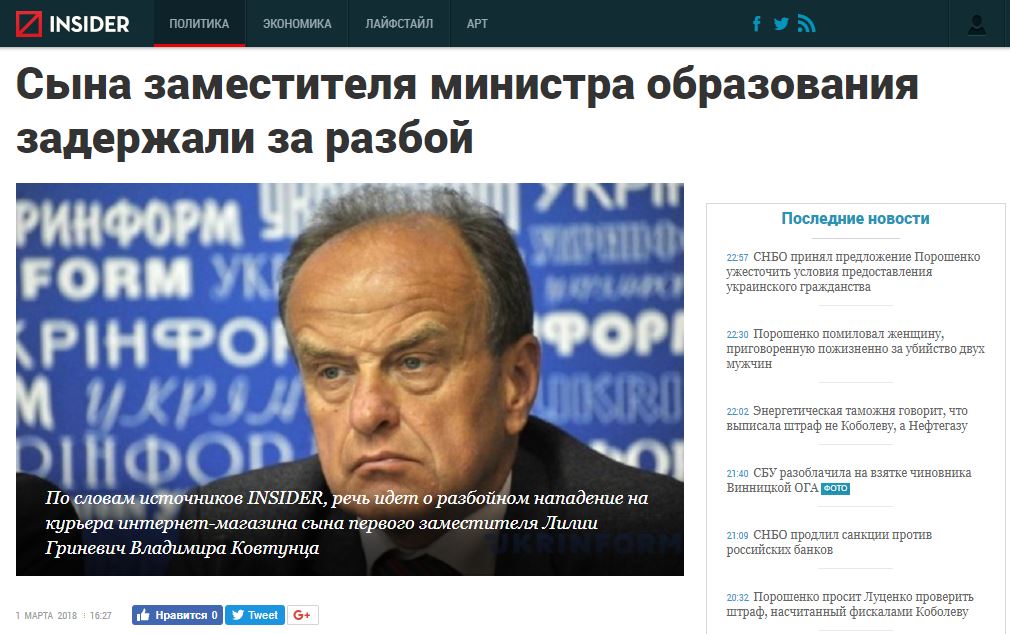 По данным источника, отпрыск украинского замминистра вместе с двумя пособниками ограбил курьера интернет-магазина, торгующего техникой.