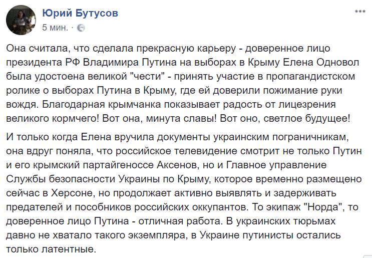 “Она считала, что сделала прекрасную карьеру - доверенное лицо президента РФ Владимира Путина на “выборах” в Крыму Елена Одновол была удостоена великой "чести" - принять участие в пропагандистском ролике, где ей доверили пожимание руки вождя. Благодарная крымчанка показывает радость от лицезрения великого кормчего! Вот она, минута славы! Вот оно, светлое будущее! И только когда Елена вручила документы украинским пограничникам, она вдруг поняла, что российское телевидение смотрит не только Путин и его крымский партайгеноссе Аксенов, но и СБУ”, - постебался журналист, уточнив, что Главное управление СБУ по Крыму, которое временно размещается в Херсоне, начало показывать отличные результаты.