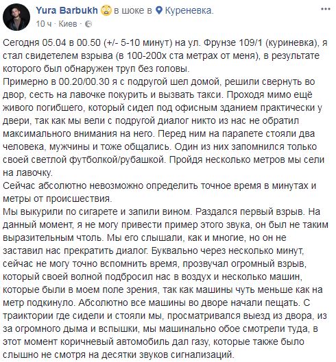 Ставший свидетелем произошедшего киевлянин Юрий Барбух на своей странице в соцсети Facebook рассказал, что перед взрывом он и его подруга сидели в близлежащем дворе, передает "Диалог.UA".