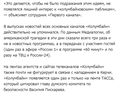 Отмечается, что на российских телеканалах вспомнили о аналогичной трагедии в США лишь три раза, и то эти упоминания звучали из уст гостей программы, а не ведущих. Теперь же российским СМИ "рекомендовано" полностью отказаться от упоминания трагедии в "Колумбайне".