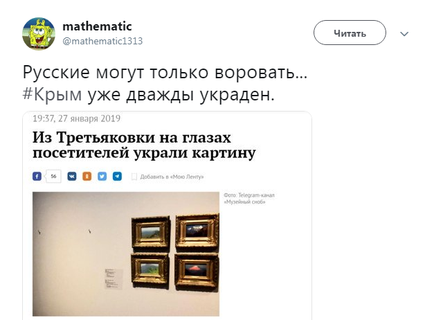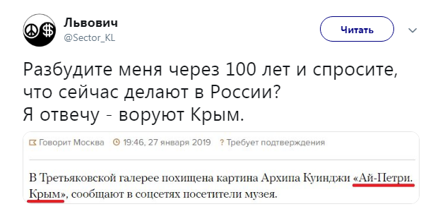 Как бы там ни было, только через 10 минут после похищения, в Третьяковке поднялся переполох, а полицейские перекрыли выходы и входы – они досматривают всех посетителей и сотрудников в надежде обнаружить "краденый Крым".