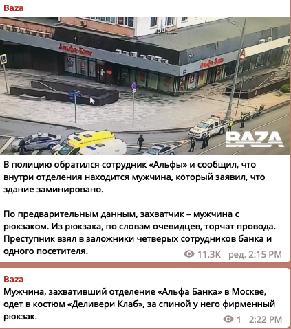 "Мужчина, захвативший отделение "Альфа-Банка" в Москве, одет в костюм "Деливери Клаб", за спиной у него фирменный рюкзак", - рассказал ресурс.