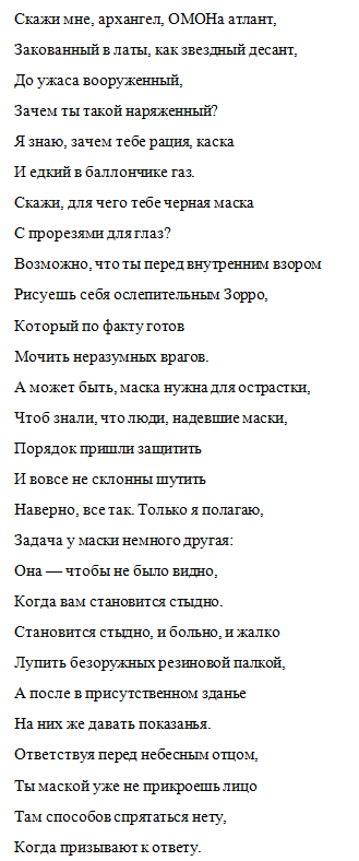 Песня артиста о событиях 27 июля в российской столице появилась в YouTube. В обличительных строках Макаревич высмеивает московских полицейских, которые безжалостно разогнали граждан. Музыкант уверен, что они надели маски, чтобы скрыть свой стыд.