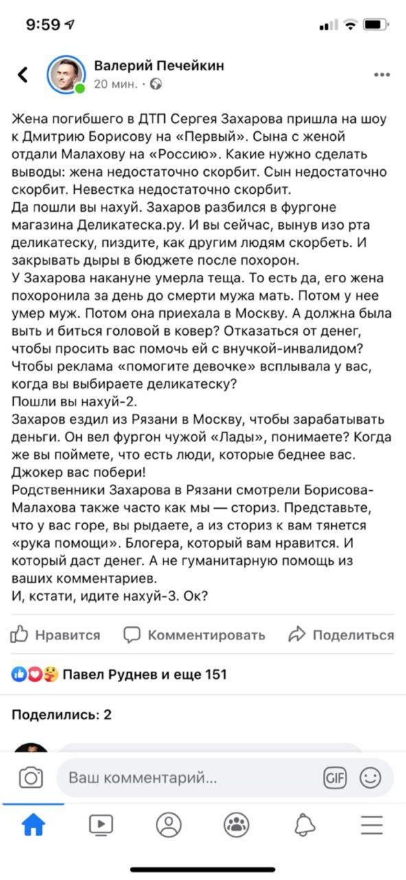 Российский драматург, сценарист, журналист Валерий Печейкин написал на своей странице в Facebook, что Сергей Захаров ездил из Рязани в Москву, чтобы зарабатывать деньги.
