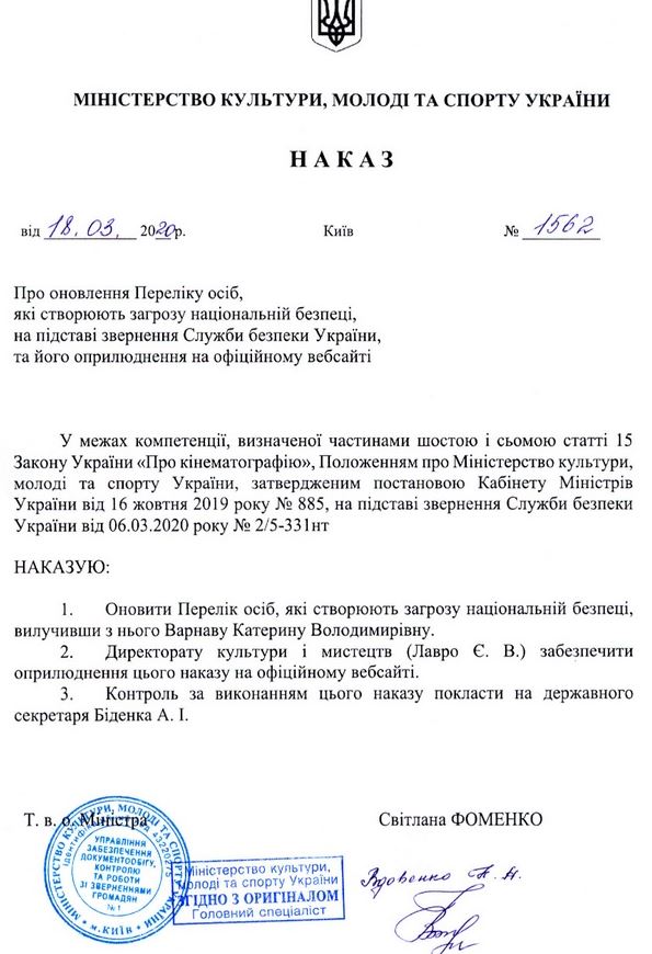 В Минкульте решили исключить из этого списка Варнаву, которой в 2017 году запретили въезд в нашу страну после незаконных гастролей в Крыму.
