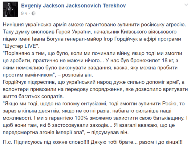 "Если мы тогда дали отпор, то сегодня с нашей военной мощью сможем разбить империю зла и подавно", - Герой Украины Гордийчук о ситуации на востоке Украины