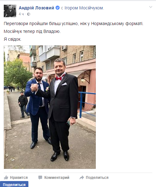 Информацию и фото о бракосочетании Игоря Мосийчука обнародовал в Facebook его коллега по партии и друг Андрей Лозовой, сообщает "Диалог.UA".