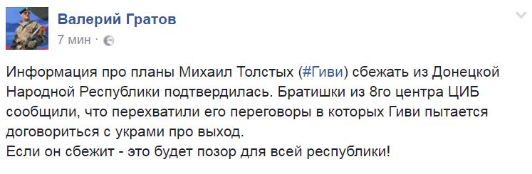 “Братишки из 8-го центра ЦИБ сообщили, что перехватили его переговоры, в которых Гиви пытается договориться с украми про выход. Если он сбежит, это будет позор для всей республики!” – сообщил Гратов.