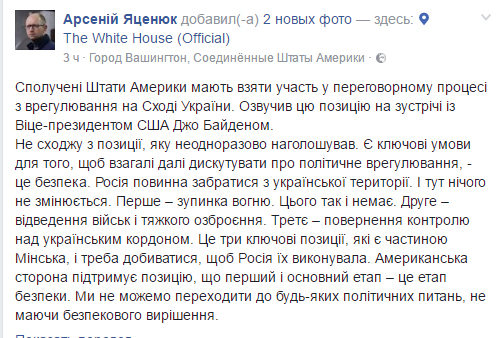 Во время встречи с вице-президентом Соединенных Штатов Джозефом Байденом бывший глава Кабмина Украины назвал три ключевых условия, которые должны выполнить стороны в Донбассе. Прежде всего необходимо окончательно прекратить огонь и развести тяжело оружие, после чего Киев должен взять под свой контроль всю часть границы с Россией. Только на этих условиях возможно дальнейшее общение с Кремлем и обсуждение судьбы Донбасса. Пока все условия не будут выполнены, Запад должен продолжать действие санкций.
