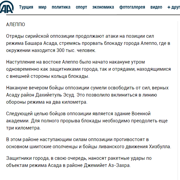 Армейские роты оппозиции в Сирии не останавливаются атаковать позиции армии Башара Асада, желая прорвать заблокированный город Алеппо, где в окружении находится триста тысяч человек.