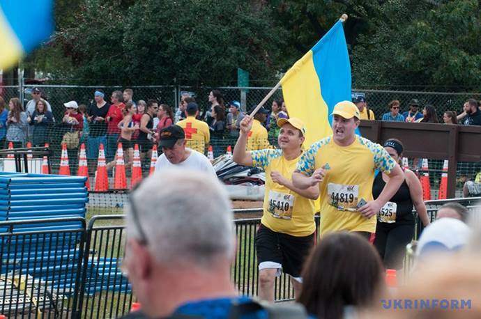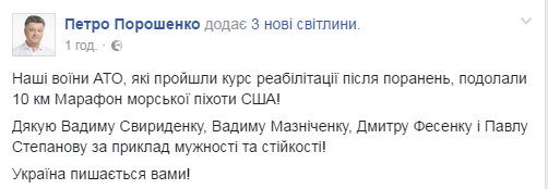"Наши воины Антитеррористической операции, которые прошли курс реабилитации после ранений, преодолели 10-километровый Марафон морской пехоты США! Спасибо Вадиму Свириденко, Вадиму Мазниченко, Дмитрию Фесенко и Павлу Степанову за пример мужества и стойкости! Украина гордится вами!" - написал Порошенко и опубликовал их фотографии.
