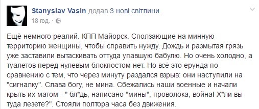 "Еще немного реалий. КПП "Майорск". Сползающие на минную территорию женщины, чтобы справить нужду. Дождь и размытая грязь уже заставили вытаскивать оттуда упавшую бабулю. Но очень холодно, а туалетов перед нулевым блокпостом нет. Но все это ерунда по сравнению с тем, что через минуту раздался взрыв: они сорвали "сигналку". Слава богу, не мина. Сбежались наши военные и начали крыть их матом", - написал он.