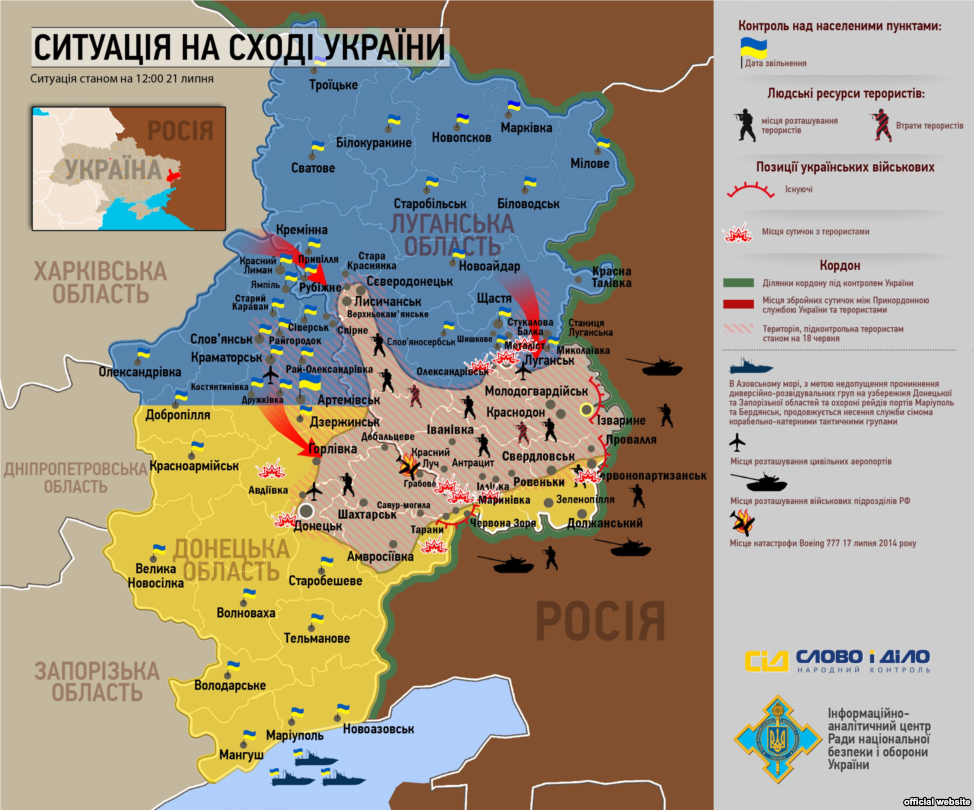 Предлагаем вашему вниманию карту АТО по состоянию на 21 июля 2014 года. На ней изображены территории, которые захвачены ополченцами, также, отмечены действия сил АТО и освобожденные территории со стороны украинской армии.