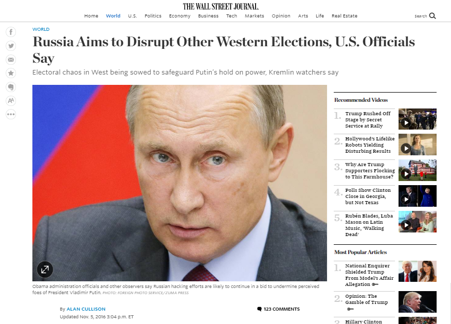 Цель Путина - очернить избирательную систему Европы и США, чтобы выиграть перевыборы в России в 2018 году и сохранить власть - WSJ