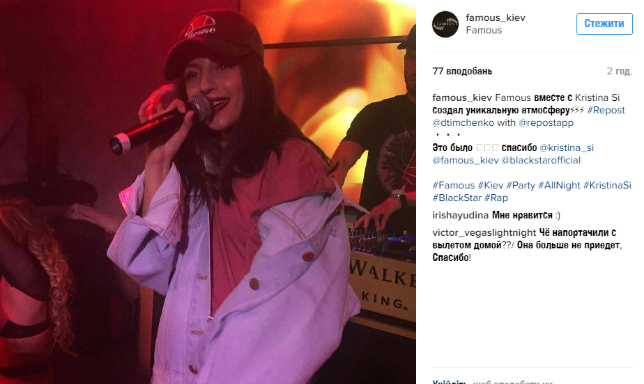 Сегодня, 6 ноября, стало известно, что российская артистка из лэйбла "Black Star", принадлежащего украиноненавистнику Тимати, Kristina Si была задержана в аэропорту Борисполь. Там гражданке РФ оповестили о том, что въезд на территорию Украины ей запрещен на 3 года из-за нарушения законодательства: летом певица незаконно посетила оккупированный Крым. Интернет-изданию "Диалог.UA" удалось узнать, что этой ночью, перед депортацией, певица дала концерт в столице Украины.
