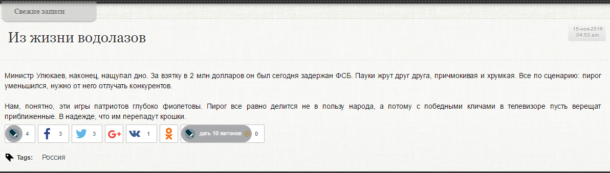 “Министр Улюкаев наконец нащупал дно. За взятку в 2 млн долларов он был сегодня задержан ФСБ. Пауки жрут друг друга, причмокивая и хрумкая. Все по сценарию: пирог уменьшился - нужно от него отлучать конкурентов”, - пишет Эль Мюрид.